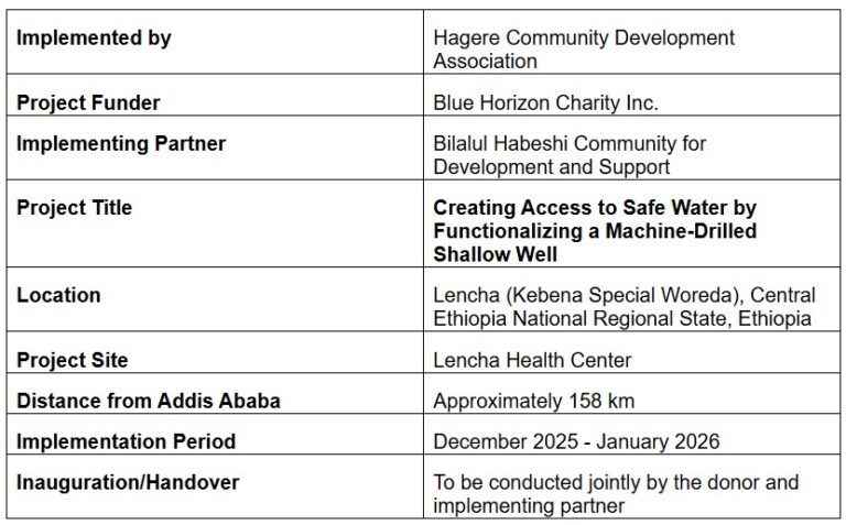 Access to reliable and safe water has been a long-standing challenge for Lencha Kebele and the local Health Center. Although water pipelines had been installed in the Health Center buildings more than ten years ago, the absence of a functional water source meant the system remained unused. This project addressed the gap by functionalizing an existing machine-drilled shallow well and installing the required infrastructure and renewable energy system to deliver safe water.
