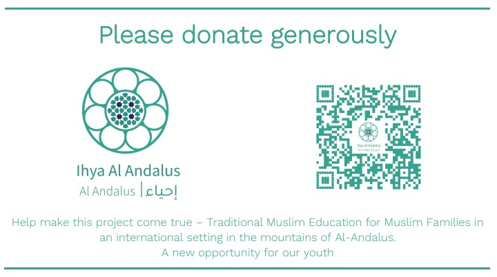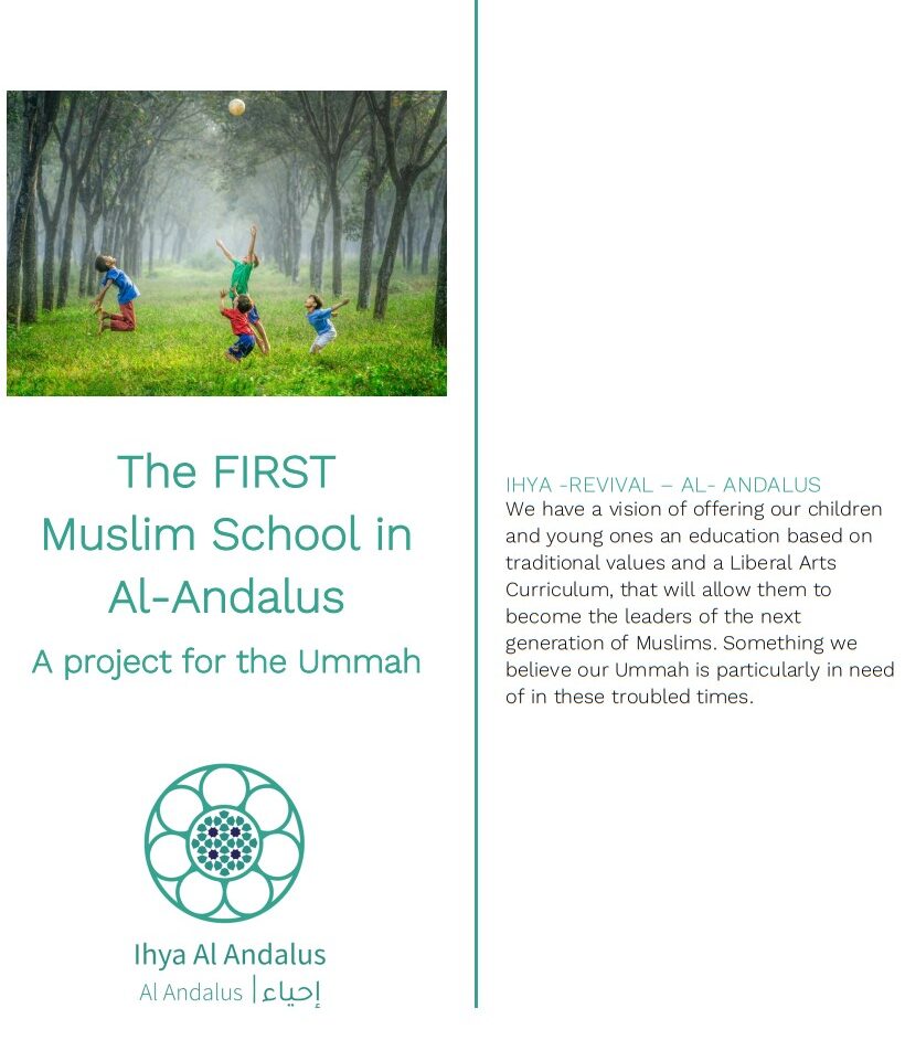 The FIRST Muslim School in Al-Andalus a project for the Ummah IHYA -REVIVAL – AL- ANDALUS with a vision of offering our children and young ones an education based on traditional values and a Liberal Arts Curriculum, that will allow them to become the leaders of the next generation of Muslims. Something we believe our Ummah is particularly in need of in these troubled times.